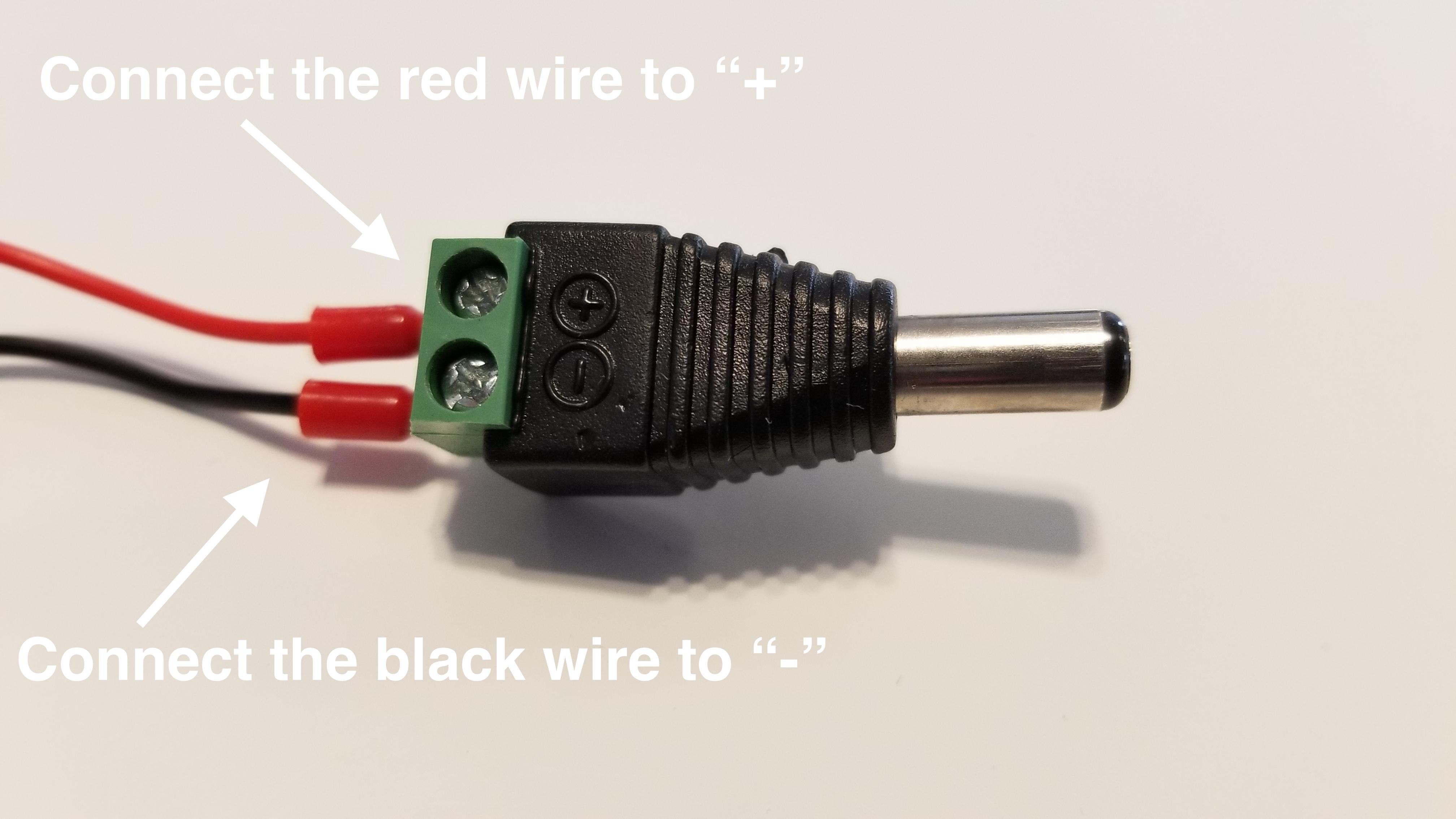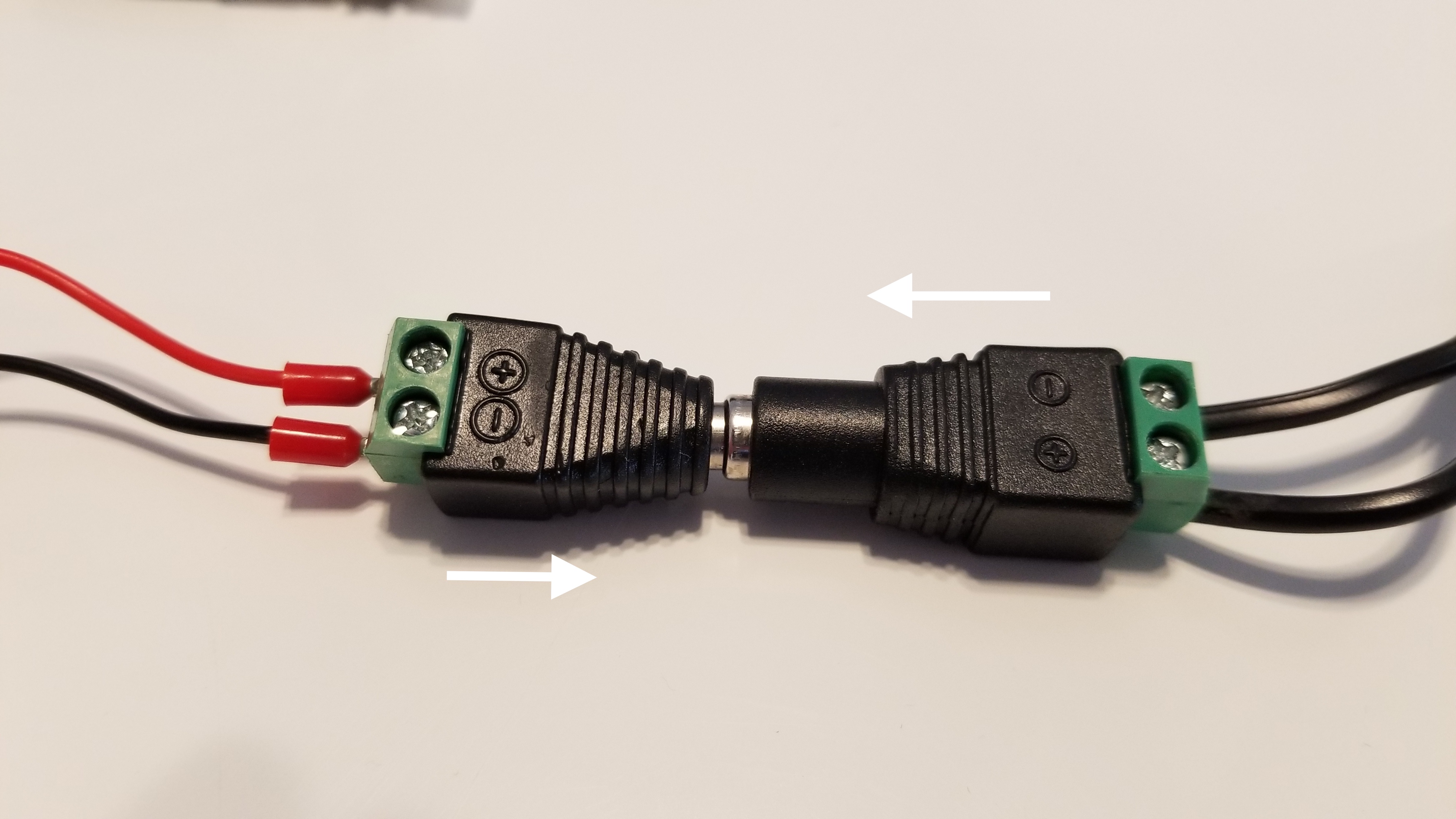 Next, grab your 24 volt power supply and the female connector. Connect the black wire to the "-" connector and the white wire to the "+" connector.