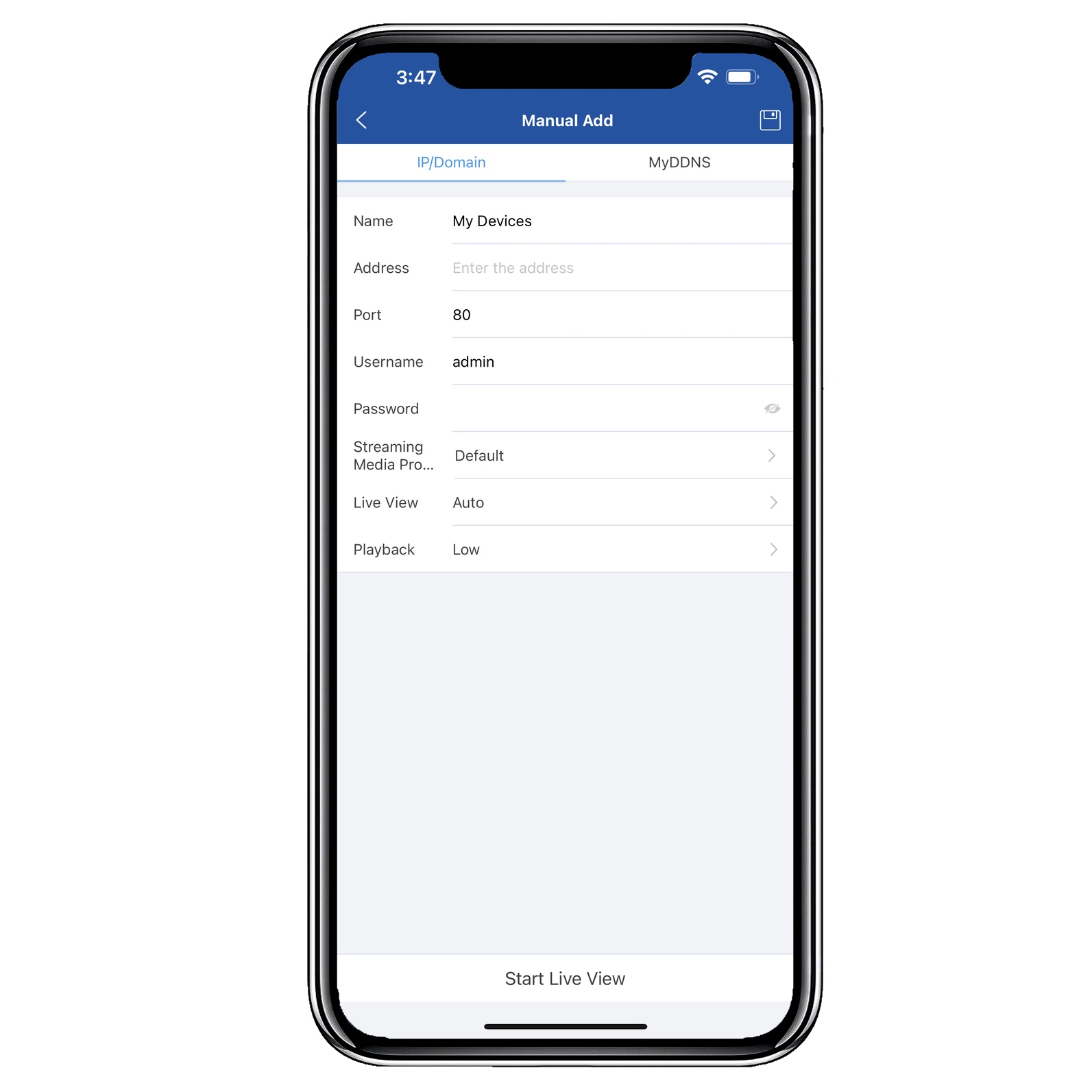 If you’re using the Star4Live cloud relay, simply tap the menu icon at the top left of the app and tap the ‘Me’ button. Log into your Star4Live account and all of your NVRs attached to that account will be automatically imported.