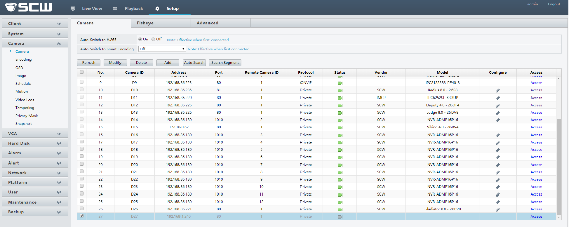After logging into your NVR, go to Setup -> Camera. Select Auto Search to find the networked camera(s) detected by your NVR: