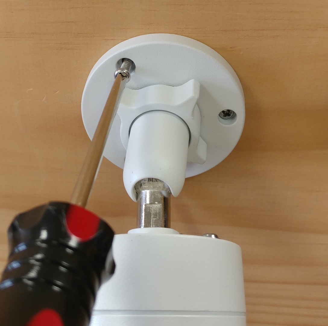 Using the supplied wood screws attach the camera or camera bracket to the wall. Use hand tools to prevent from stripping the mounting points.
