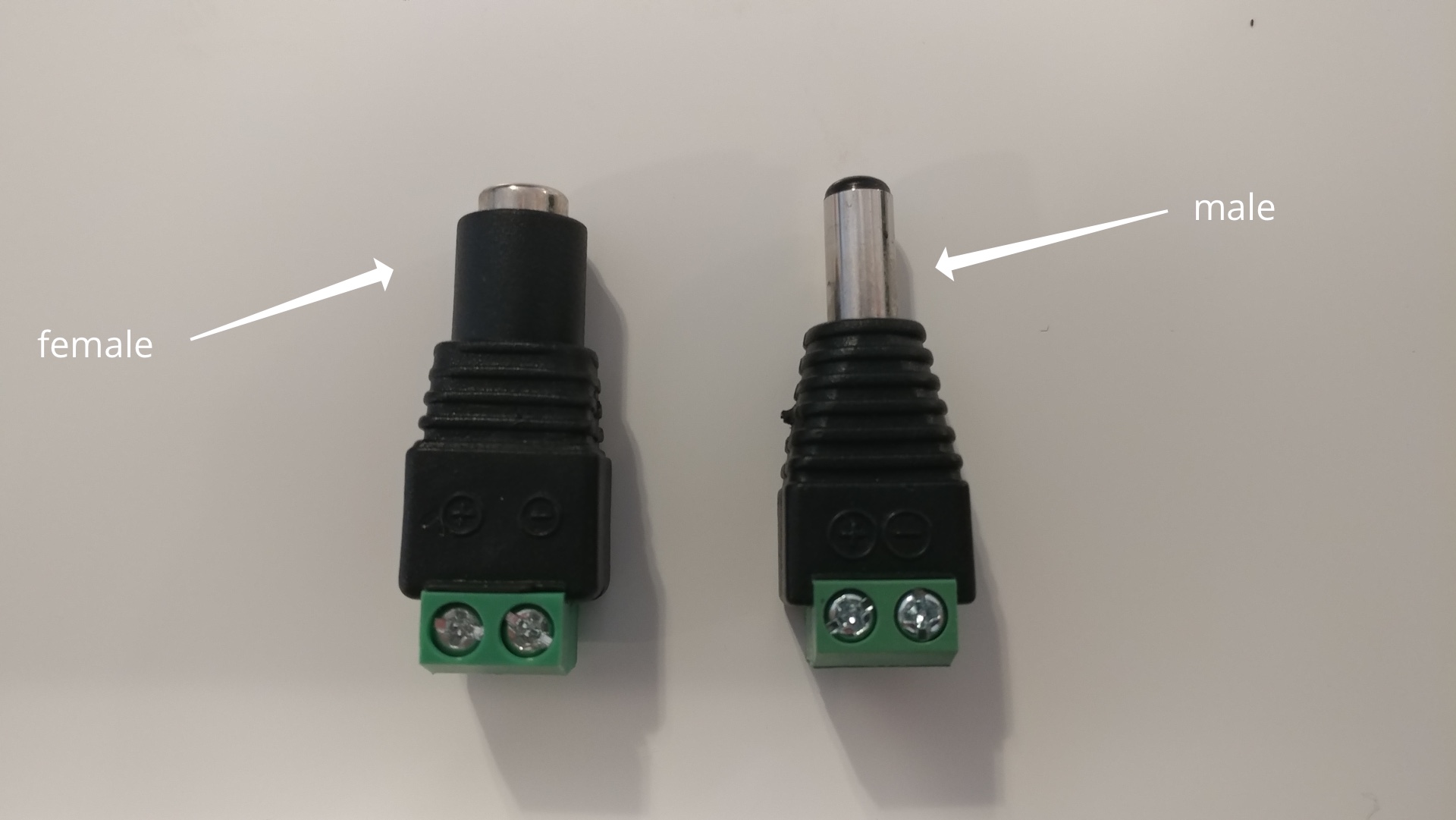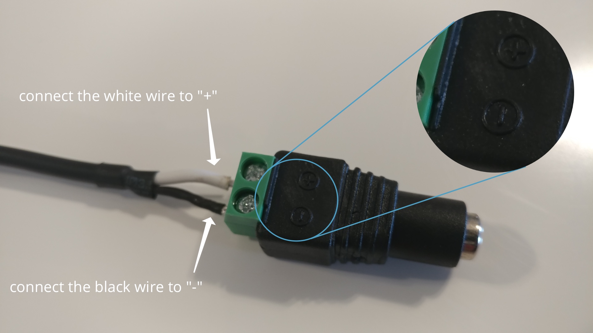 Next, grab your 24 volt power supply and the female connector. Connect the black wire to the "-" connector and the white wire to the "+" connector.
