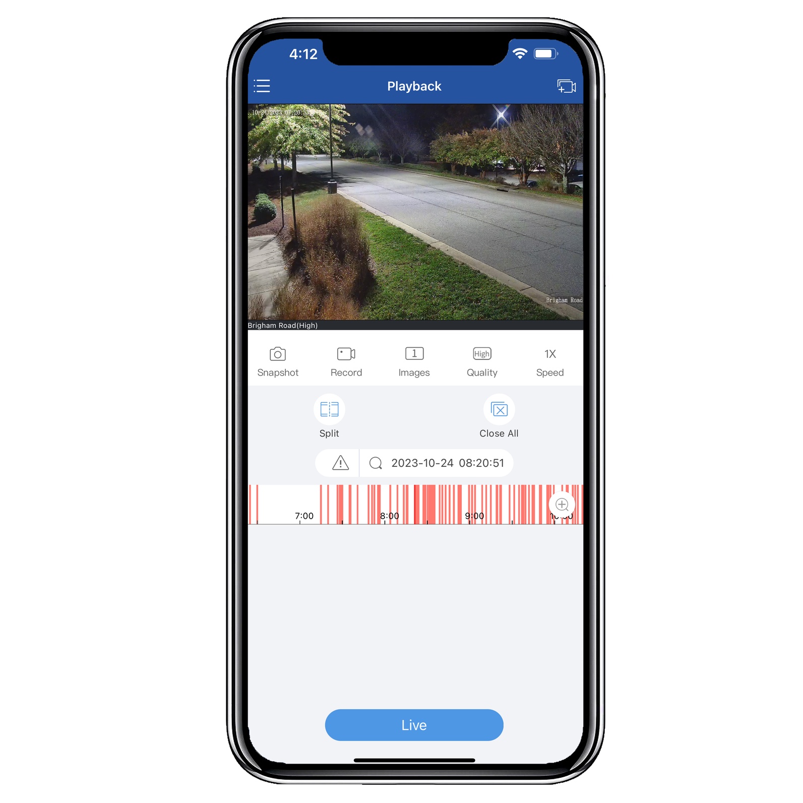 In playback, you’ll see the timeline at the bottom of the screen. Drag your finger across the timeline to go forward or backwards and you can even speed the footage up to 4x speed. To see a shorter period of time, simply zoom into the timeline by using the magnifying glass icon.