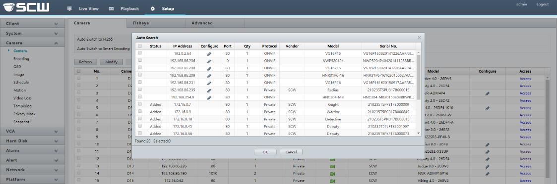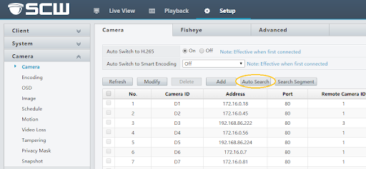 After logging into your NVR, go to Setup -> Camera. Select Auto Search to find the networked camera(s) detected by your NVR: