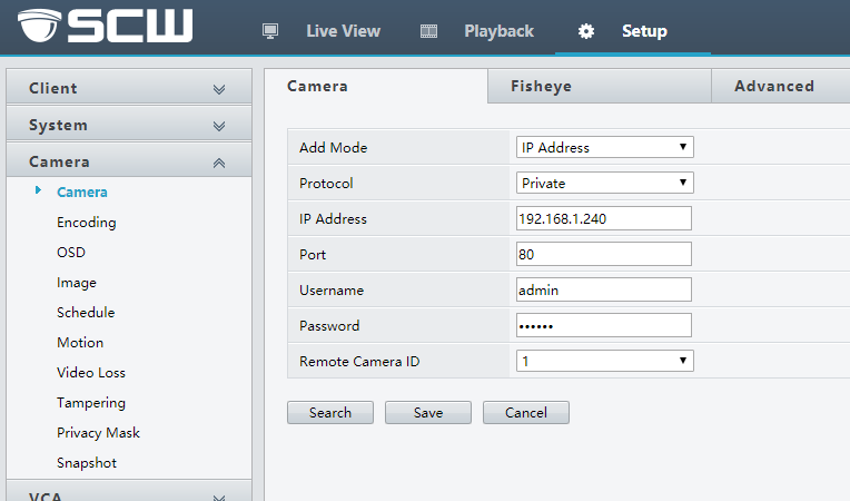 Change the Add Mode to IP Address and input the camera’s IP and password. The default username and password are admin and 123456, respectively, and save: